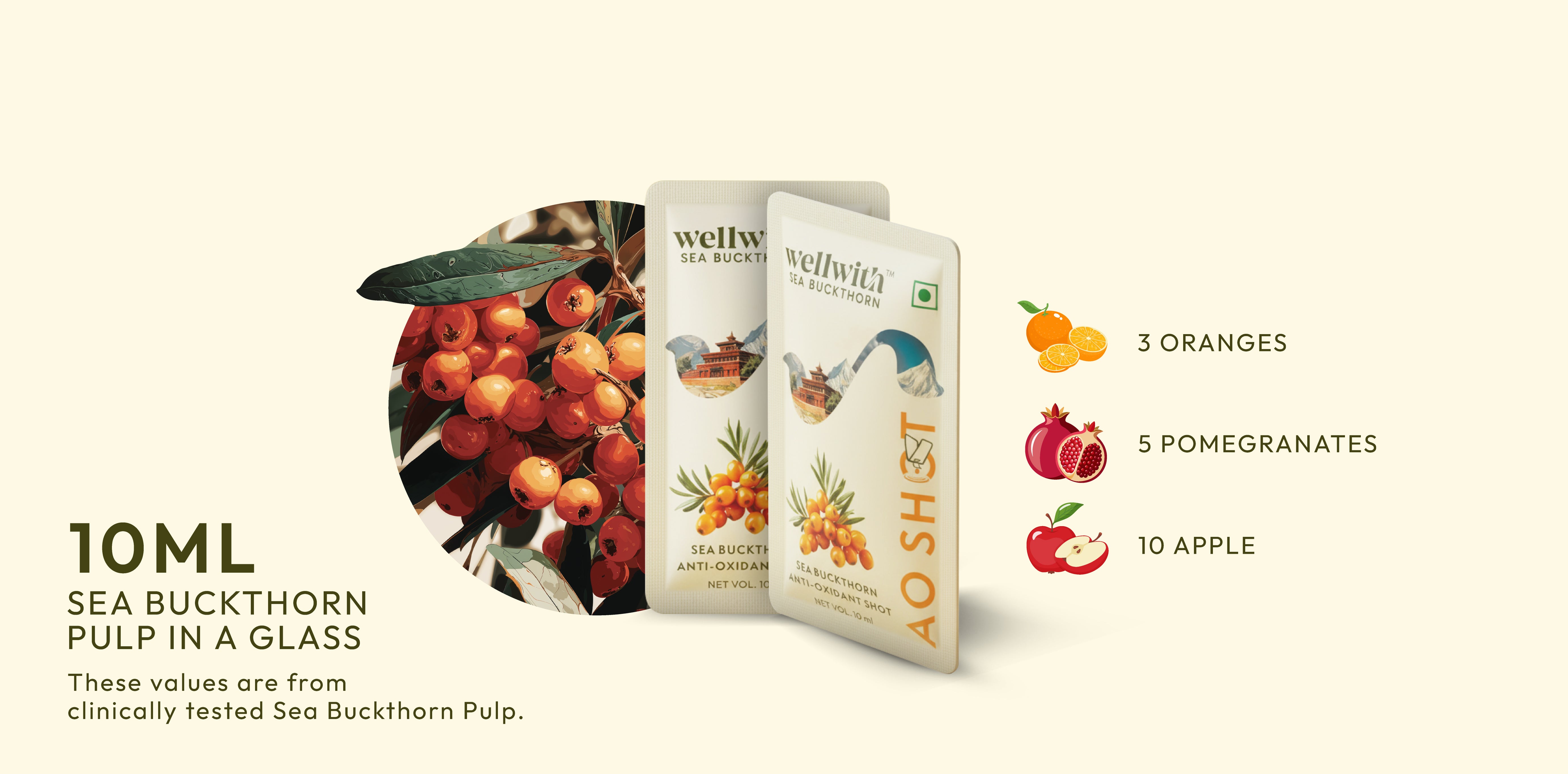 Designed for daily health, Sea Buckthorn Antioxidant (AO) Shot is one of the best antioxidant supplements. Every shot comprises a concentrated mix of natural vitamins, minerals, and antioxidants obtained from Himalayan Sea Buckthorn, a superfruit famed for its great nutritional content.