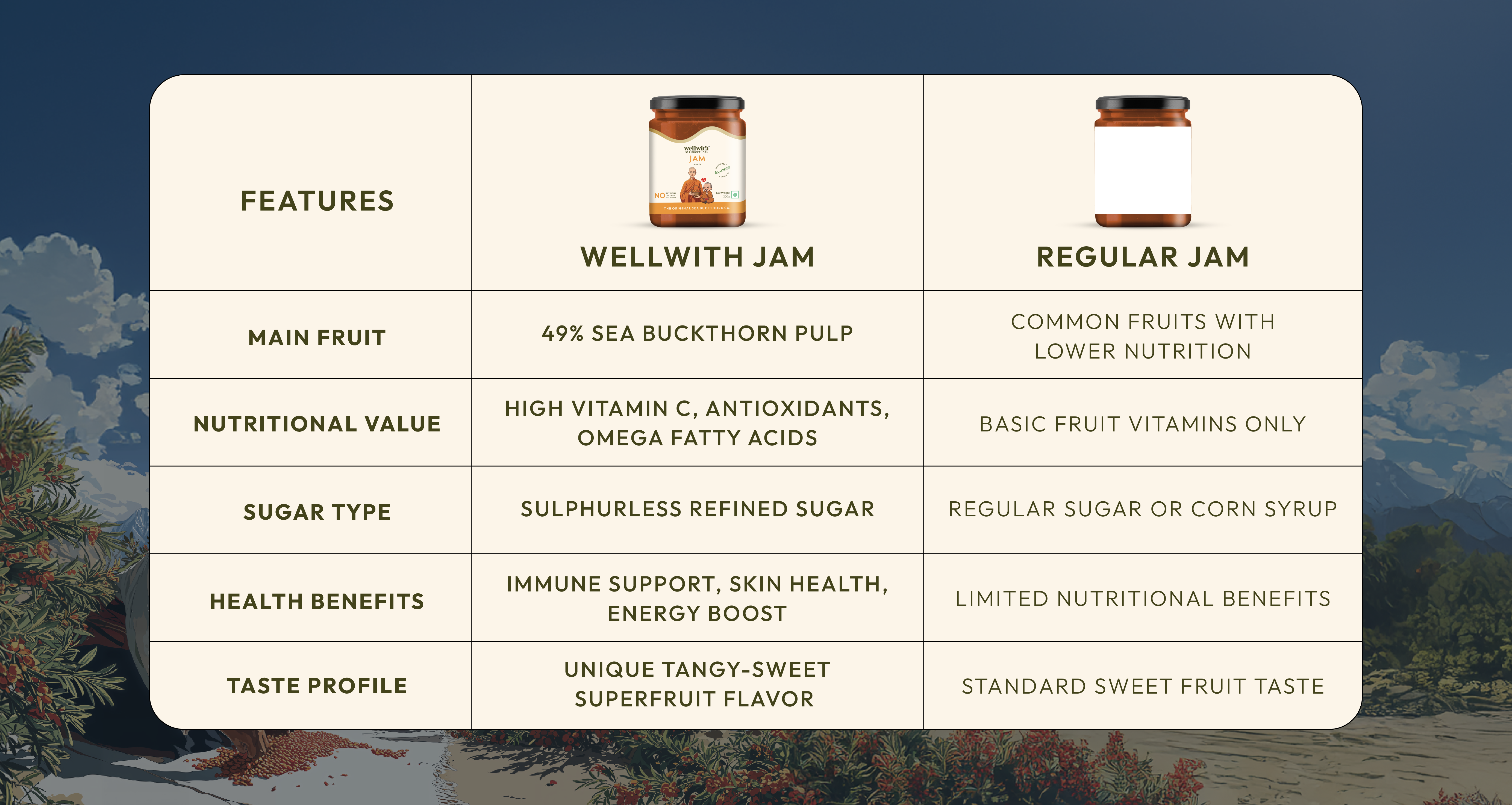 Experience the super tasty, healthy, and nutrient-dense WellWith sea buckthorn jam made with 100% natural Ladakh-sourced sea buckthorn berries. Packed with omega-3, 6, 7, and 9 with vitamin C, minerals, and antioxidant properties, this superfood supports immunity, skin glow, and gut health. By incorporating each spoonful of sea buckthorn berry jam, you get numerous health benefits. Its bright orange color and smooth texture make it a super delicious and healthy addition to every meal.