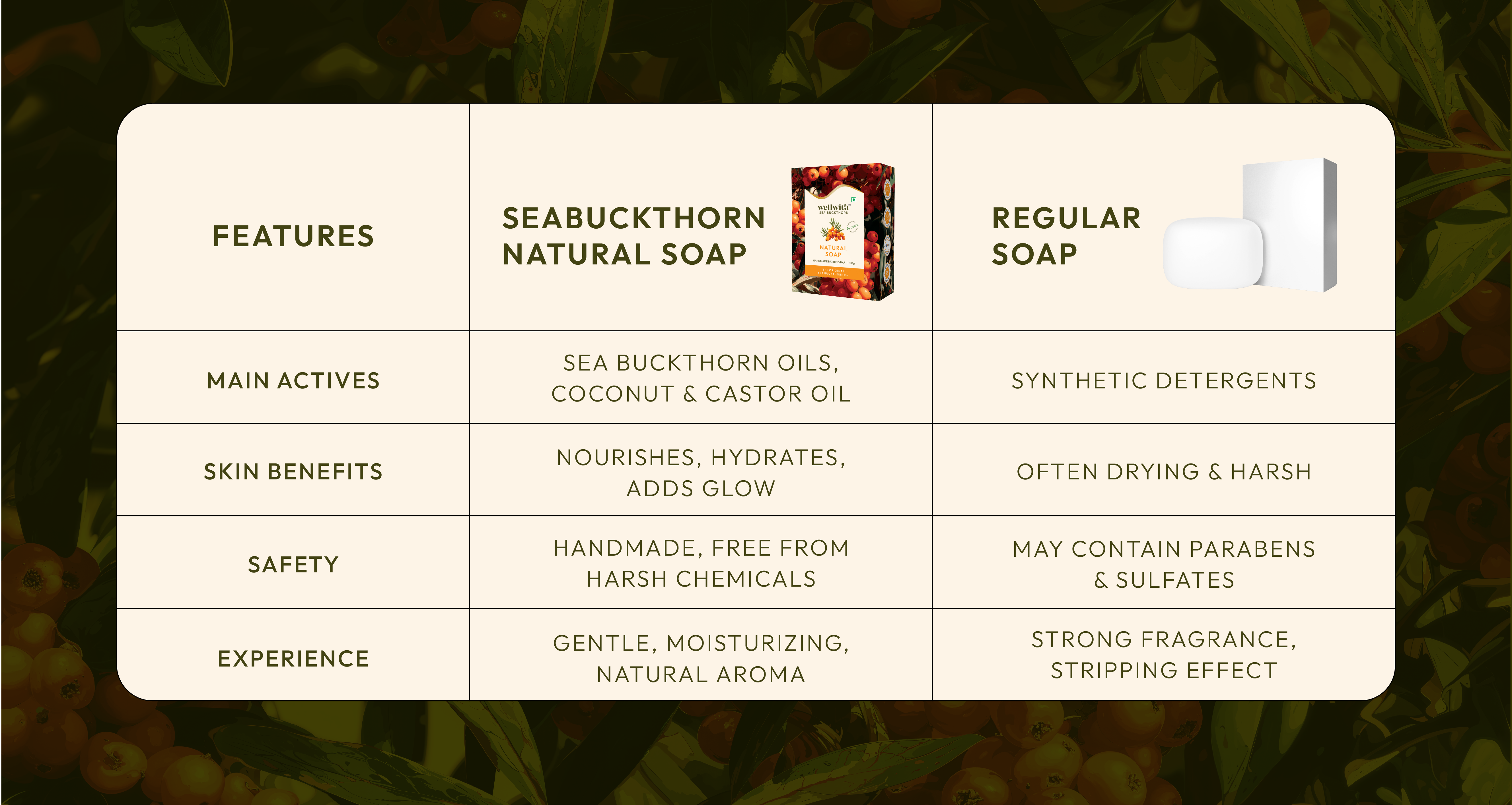 Sea Buckthorn soap protects the skin from environmental damage through its rich antioxidant content, which helps neutralize free radicals and defend the skin from cellular stress. This protection can help reduce the appearance of fine lines, wrinkles, and age spots, promoting healthier-looking skin.