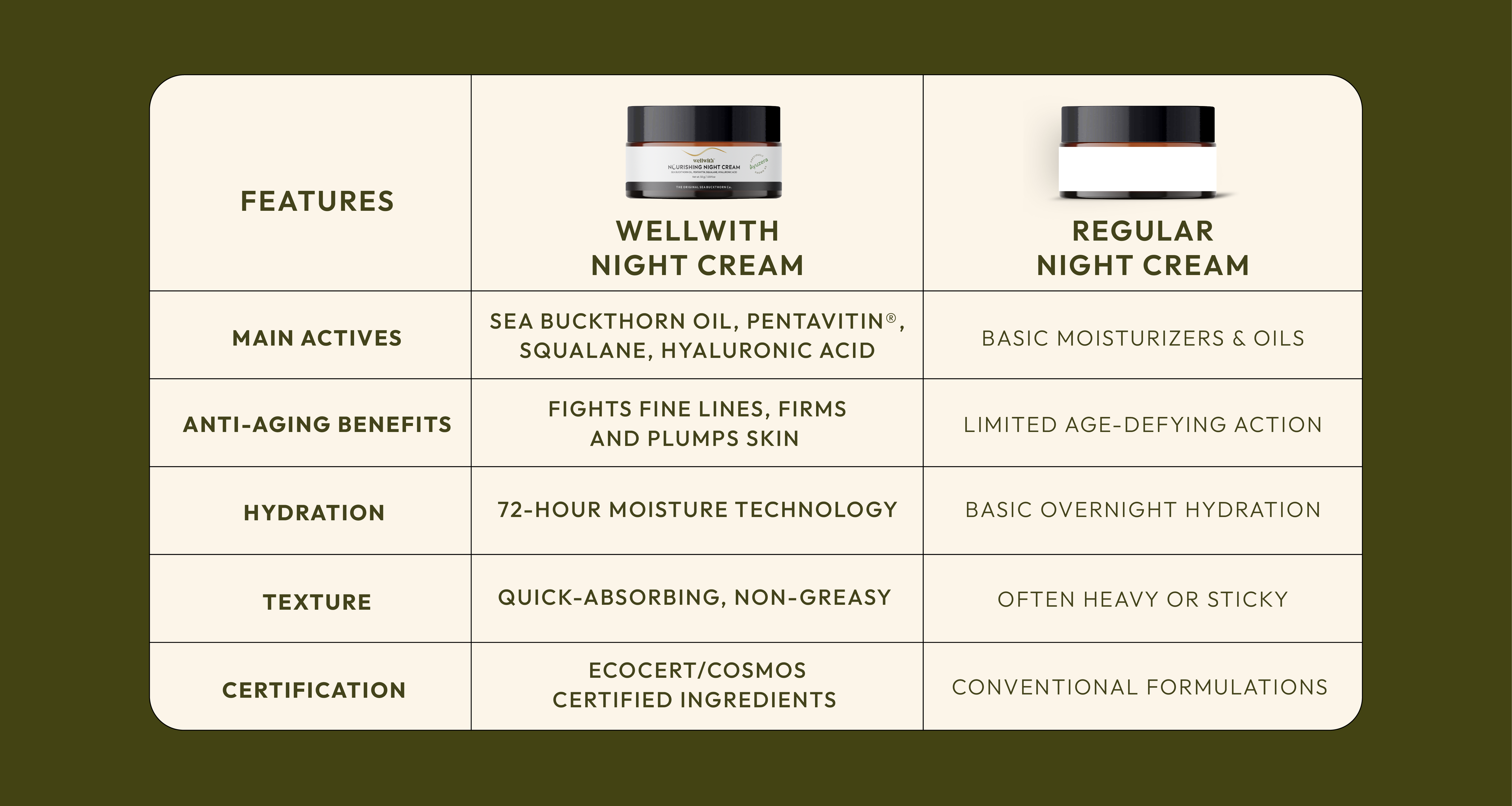 No, WellWith Night Cream is free from parabens, sulfates, synthetic fragrances, and other harsh chemicals. It’s formulated with clean, skin-friendly ingredients for safe, everyday use.