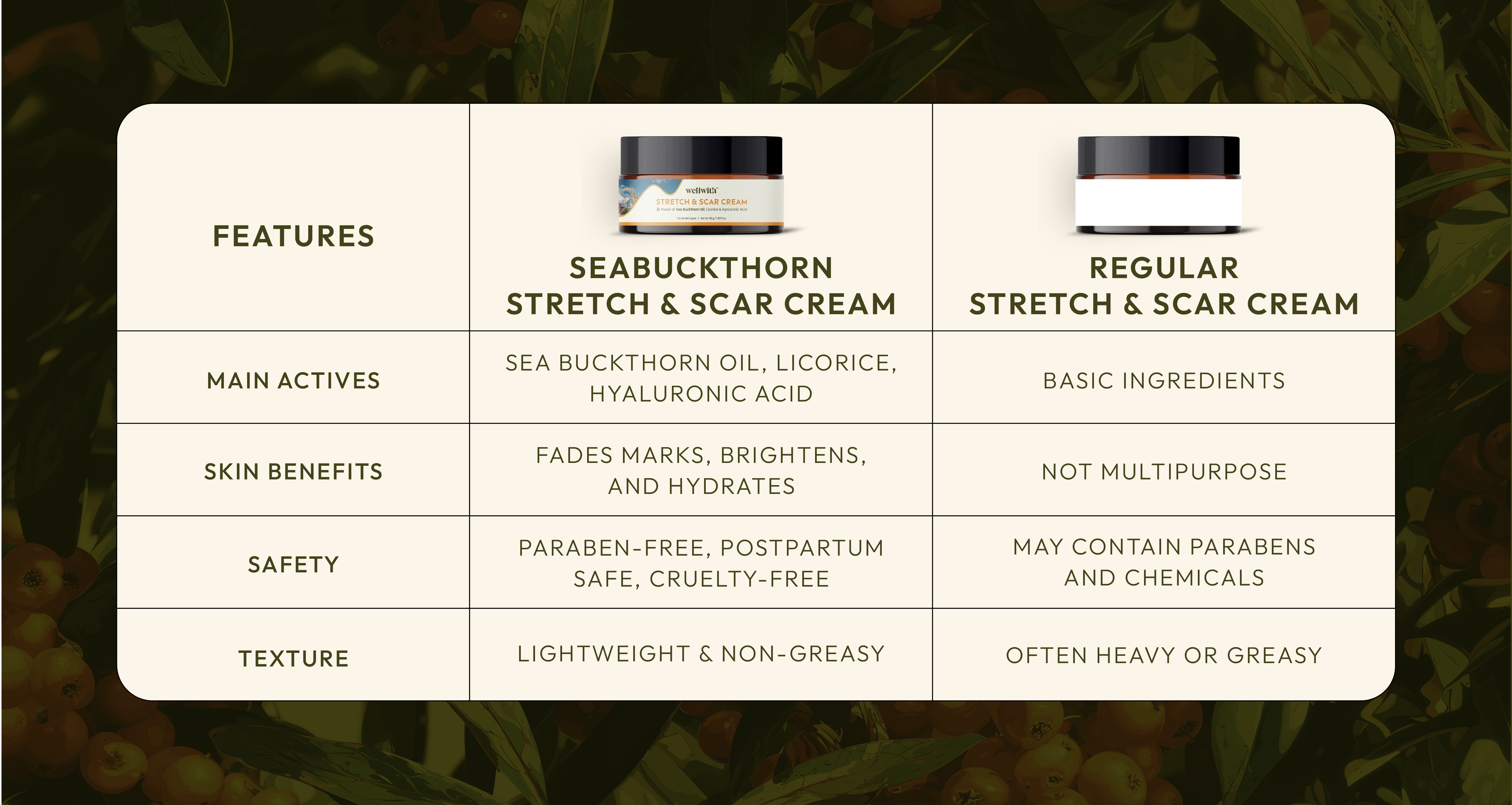 WellWith Stretch & Scar Cream is an effective solution to minimize the visibility of marks and scars. The best stretch mark cream contains 3X potency of Sea Buckthorn Oil, Hyaluronic Acid, and Licorice Extract to yield intensive regenerative and calming effects. Infused with pure Sea Buckthorn oil, which is full of Omega-7, Vitamin E, and antioxidants, WellWith stretch and scar cream promotes skin cell regeneration, inhibits inflammation, and removes marks naturally. Licorice extract lightens pigmentation and evens out skin tone, while Hyaluronic Acid intensely holds moisture to give elasticity and natural texture to skin.