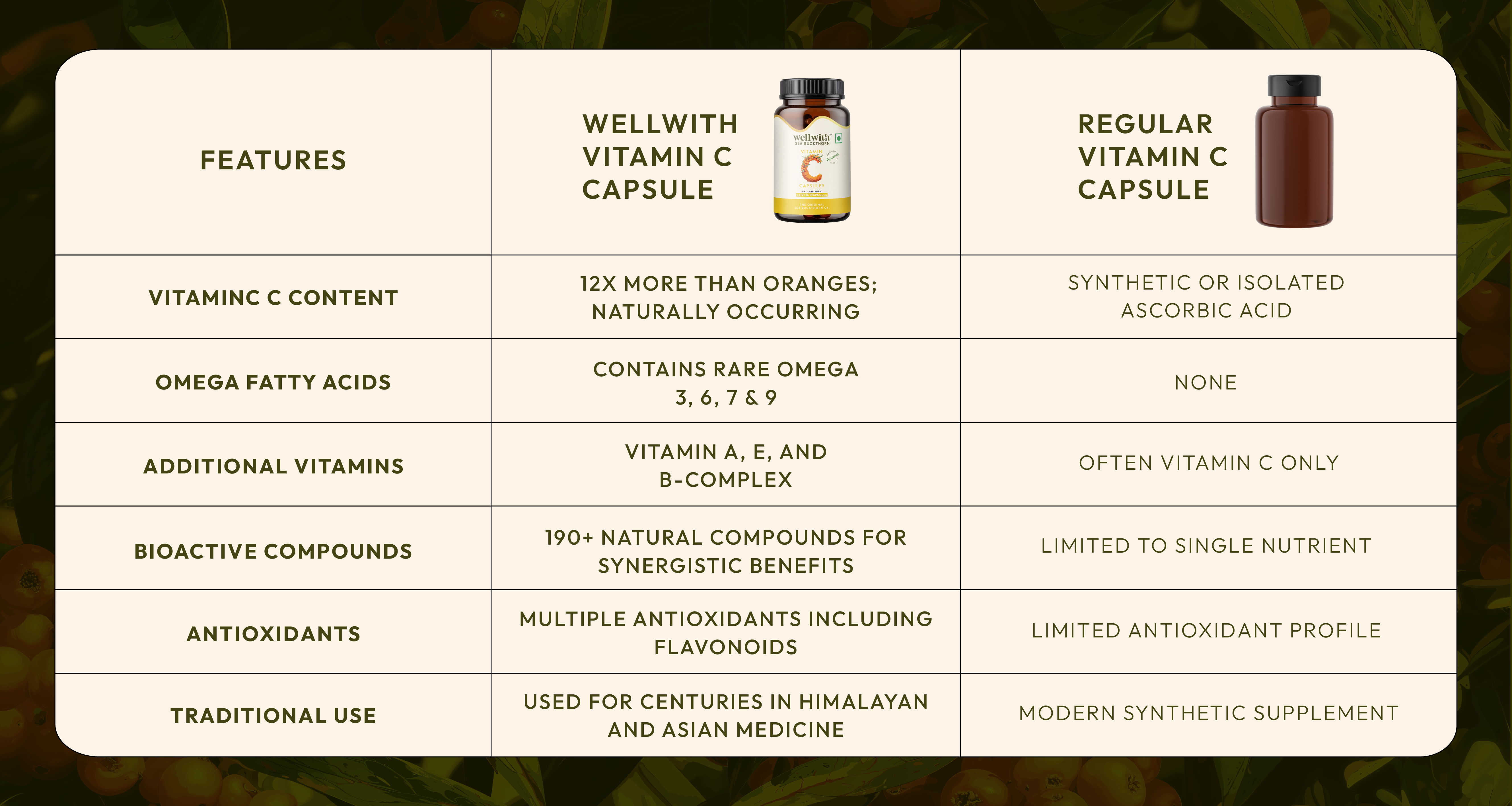 WellWith Vitamin C Capsules are formulated with high-quality Vitamin C, omega-3, 6, 7, and 9 fatty acids, vitamin A, E, Carbohydrate, cholesterol, and more to support your daily nutritional needs. Each capsule is carefully crafted to deliver the right amount of Vitamin C in an easy-to-consume form. WellWith ensures purity, consistency, and quality in every capsule, making it a reliable addition to your wellness routine.
