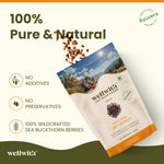 Well With dried Sea Buckthorn berry is a premium-quality superfood sourced from the high-altitude terrains of Ladakh, where the berries are wild-harvested and shade-dried in small batches to retain their natural composition. Each 100 g pack contains whole dried berries loaded with vitamins, calcium, potassium, sodium, protein, and fiber, preserved without sugar or additives.