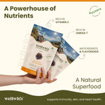 Each pack of WellWith dry Sea Buckthorn berries are rich in vitamin C (998 mg/100 g), vitamin E (56–140 mg/kg), carotenoids, flavonoids, dietary fiber (4–8 g/100 g), minerals such as potassium, calcium, magnesium, and iron, and fatty acids including omega‑3, 6, 7, and 9. This organic Sea Buckthorn berry offers a naturally tart flavor with a subtle hint of sweetness, adding a vibrant zing to any dish.
